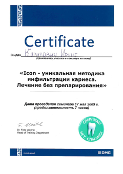 присвоена первая квалификационная категория по квалификации «Врач-стоматолог-терапевт»;