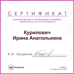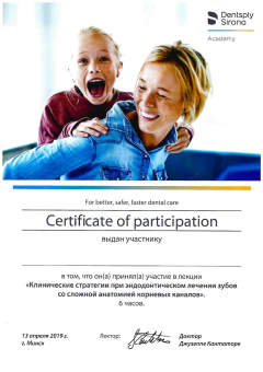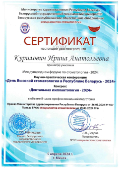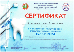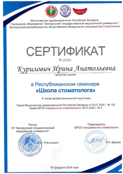 окончила подготовку в клинической ординатуре УО «БГМУ» по специальности «Стоматология терапевтическая».